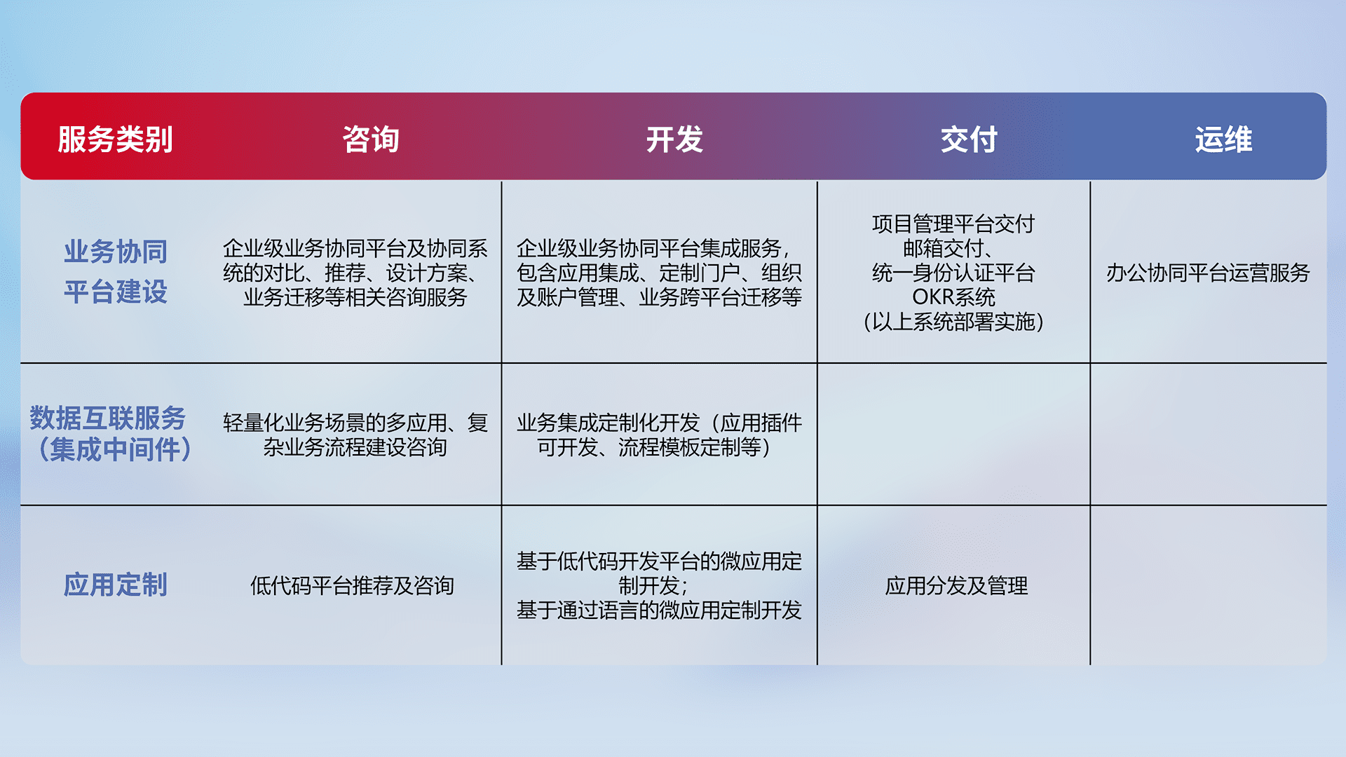 针对钉钉、、企微、、、、IDaas等平台级产品提供产品的规划、、、、方案、、、交付、、定制化开发等服务,,,,实现如统一协同办公、、、智能客户服务、、混合会议管理、、智能数据查询、、、等业务场景,,,实现数字化转型。。。。